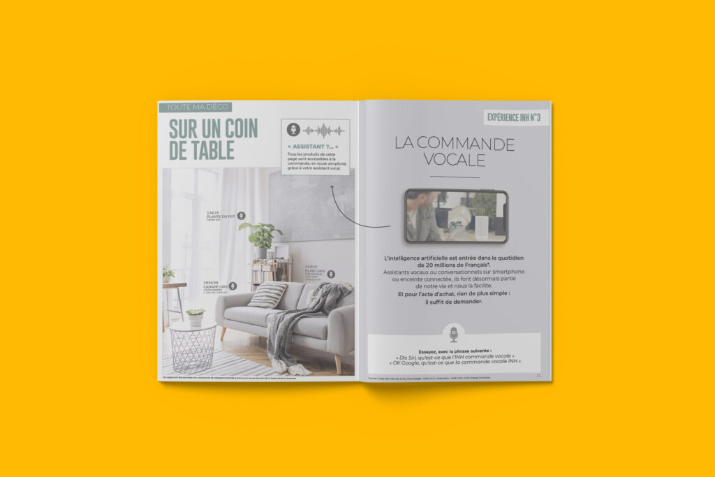 Le foyer est le lieu où les projets sont débattus et décidés. Il est non seulement le lieu le plus essentiel de l’existence, mais il est de plus en plus multifonctionnel et surinvesti. La Poste Solutions Business a donc créé INH-Inside Home, la première offre globale de solutions marketing au domicile pour faire vivre de nouvelles expériences aux consommateurs et inspirer leurs achats. Je souhaitais offrir une immersion totale dans ce catalogue innovant en créant une démo d’offres fictives mais avec de véritables expériences : La réalité augmentée, le papier innovant, l’association avec des influenceurs, l’échantillonnage et bien d’autres…